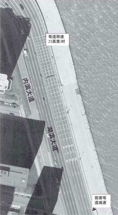 让我们再来看一个例子。芝加哥的湖滨大道是世界上最美的城市风景之一,这条公路沿着芝加哥的东界——密歇根湖而建。在这条公路上驾车兜风,你可以将芝加哥的美景尽收眼底。这条公路有一段是一个S形的危险弯路,许多司机都因为没有注意到那个25英里