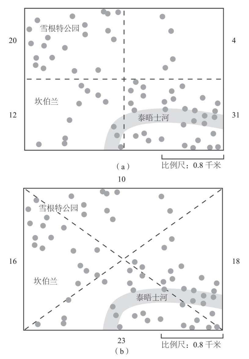 尽管如此,图1–3中的轰炸点看上去并不像是随机分布的。原因在哪里呢?“二战”给了我们最好的答案。假如我们将图1–3平均分成4个部分,如图1– 4(a),然后再进行一次统计,或者说不是为了统计而统计,而只是数一下每个部分遭到轰炸的次数,我们的确会发现非随机性的证据。但是,没有证据能够表明这种测试随机性的方法是正确的。假如我们按照图1– 4(b)的方式再次将图1–3平均分成4部分,我们便无法否定炸弹是随机抛下的假设了。不幸的是,我们往往不会通过这样严格的交替测验来挑战自己的认知。