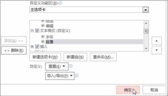 步骤10 确认自定义功能设置 。选中的命令组即被删除,完成选项卡的新建和设置后,单击“确定”按钮即可,如下图所示。