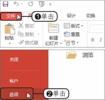 步骤01 单击“选项”命令 。启动PowerPoint 2016,❶单击“文件”按钮,❷在弹出的菜单中单击“选项”命令,如下图所示。