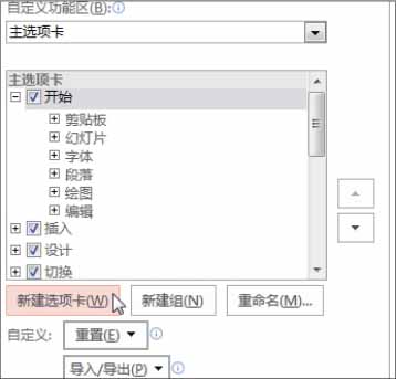 步骤03 新建选项卡 。切换至“自定义功能区”选项面板中,在“自定义功能区”选项组中单击“新建选项卡”按钮,如下图所示。