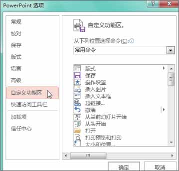 步骤02 单击“自定义功能区”选项 。弹出“PowerPoint选项”对话框,在左侧列表框中单击“自定义功能区”选项,如下图所示。