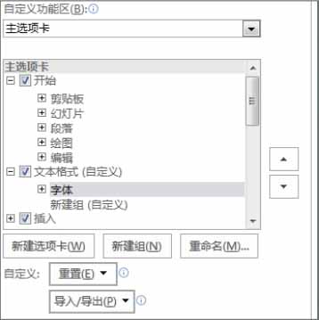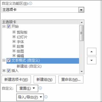 自定义功能区可以让用户在功能区中自定义新的选项卡,并且能对现有功能区中的按钮或命令位置进行调整,例如在PowerPoint 2016中将文本处理命令如字体、段落等移至新建的“文本格式”选项卡中,具体操作如下。