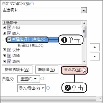 步骤04 重命名新建选项卡 。此时在列表框中创建了“新建选项卡”和“新建组”选项,❶单击“新建选项卡”选项,❷然后单击“重命名”按钮,如下图所示。