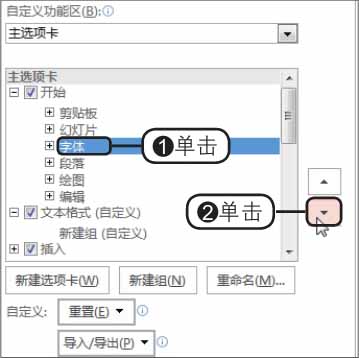 步骤07 调整命令组位置 。❶单击“字体”选项,❷单击右侧的“下移”按钮,如下图所示。