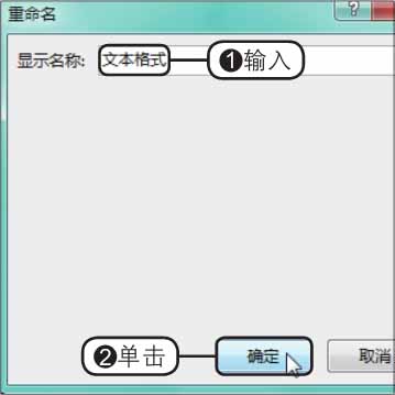 步骤05 输入新建选项卡名称 。弹出“重命名”对话框,❶在“显示名称”文本框中输入名称,这里输入“文本格式”,❷单击“确定”按钮,如下图所示。