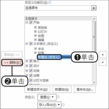 步骤09 删除多余命令组 。用相同的方法,将“段落”组移至“文本格式”选项卡下,❶然后单击选中“新建组”选项,❷单击“删除”按钮,如下图所示。