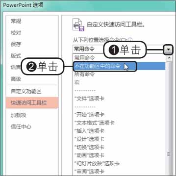 步骤02 选择命令所在位置 。弹出“PowerPoint选项”对话框,自动切换至“快速访问工具栏”选项面板中,❶单击“从下列位置选择命令”右侧的下三角按钮,❷从展开的下拉列表中单击“不在功能区中的命令”选项,如下图所示。