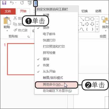 步骤01 单击“其他命令”选项 。若要自定义快速访问工具栏,❶单击快速访问工具栏右侧的下三角按钮,❷从展开的下拉列表中单击“其他命令”选项,如下图所示。