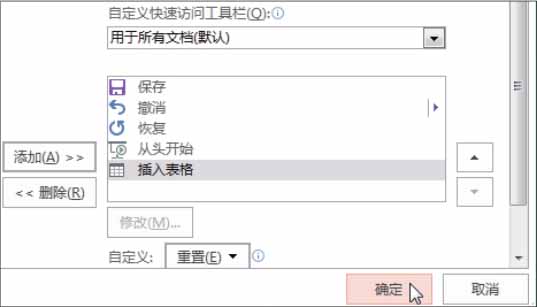 步骤04 确认添加命令 。选择的命令添加到“自定义快速访问工具栏”列表框中,单击“确定”按钮,如下图所示。