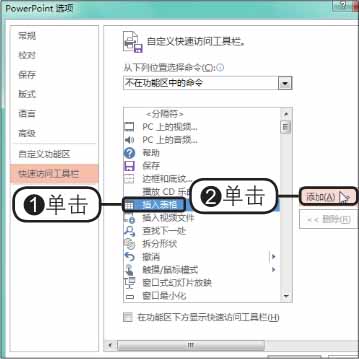 步骤03 选择要添加的命令 。在下方的列表框中单击要添加到快速访问工具栏中的命令,❶如单击“插入表格”选项,❷然后单击“添加”按钮,如下图所示。