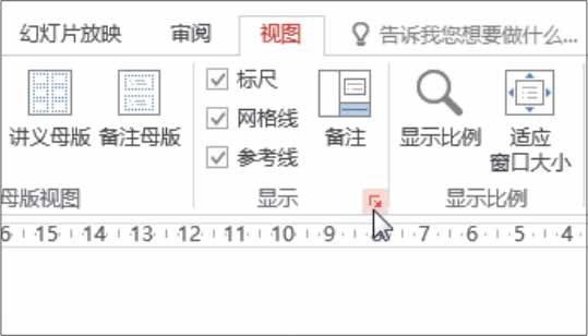 步骤01 勾选“标尺”复选框 。启动PowerPoint 2016,若要显示标尺,切换至“视图”选项卡下,在“显示”组中勾选“标尺”复选框,如下图所示。