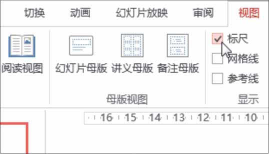 步骤01 勾选“标尺”复选框 。启动PowerPoint 2016,若要显示标尺,切换至“视图”选项卡下,在“显示”组中勾选“标尺”复选框,如下图所示。
