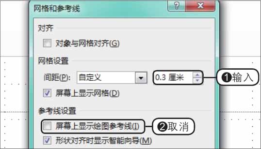 步骤05 设置网格线和参考线属性 。弹出“网格和参考线”对话框,❶在“网格设置”选项组的“间距”数值框中输入“0.3厘米”,❷在“参考线设置”选项组中取消勾选“屏幕上显示绘图参考线”复选框,如下图所示。