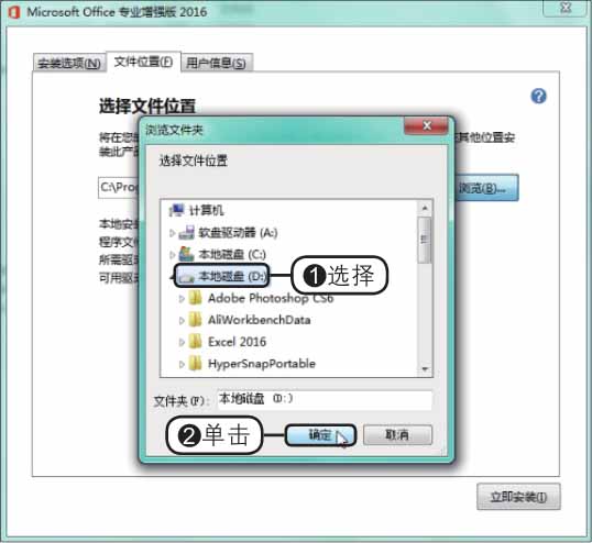 步骤05 选择文件位置 。弹出“浏览文件夹”对话框,❶选择文件安装位置,如选择“本地磁盘(D:)”,❷单击“确定”按钮,如下图所示。
