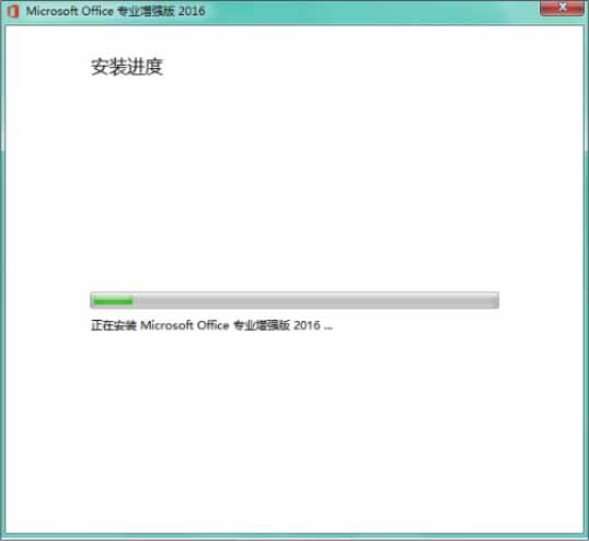 步骤07 显示安装进度 。系统开始安装选中的Offce2016组件到计算机的指定位置,并显示软件的安装进度,如下图所示。