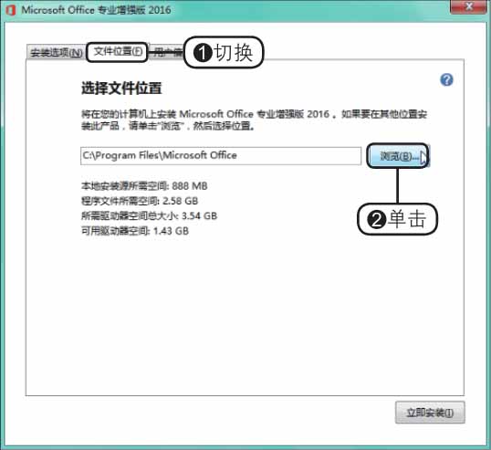 步骤04 设置安装路径 。❶切换至“文件位置”选项卡,❷单击“浏览”按钮,设置安装路径,如下图所示。