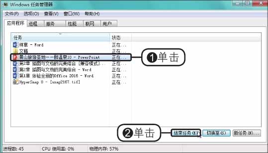 步骤02 强制结束PowerPoint应用程序 。弹出“Windows任务管理器”对话框,在“应用程序”选项卡中,❶单击要结束的任务,❷再单击“结束任务”按钮即可强制退出程序,如下图所示。 qNJyRXmJ2rXuHlEn4HqEdj202FW6Z4gRvYcAXY4xyiiuAZ9AWADAI4OhrC4xtKaH