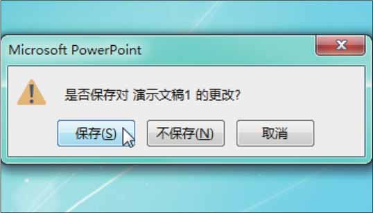 步骤02 提示保存 。如果演示文稿中编辑的内容未保存,将弹出Microsoft PowerPoint对话框,提示是否保存对演示文稿的更改,如果保存,单击“保存”按钮,反之则单击“不保存”按钮,若要取消应用程序的强制关闭,单击“取消”按钮即可,如下图所示。