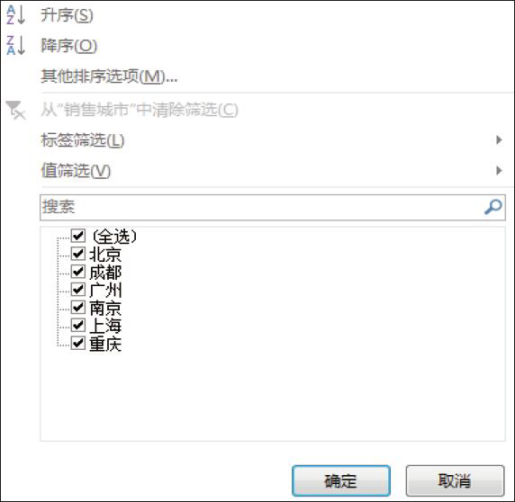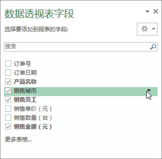 字段下拉列表: 指可在字段中显示项的列表。单击字段列表中任意字段右侧的下三角按钮(见图1-15),展开的列表即为字段下拉列表,如图1-16所示。