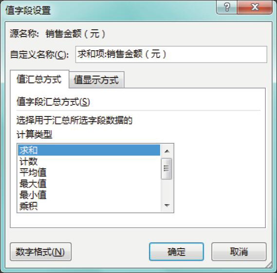 汇总函数: 指用来对数据字段中的值进行合并的计算类型。数据透视表通常为包含数字的数据字段使用“求和”函数,为包含文本的数据字段使用“计数”函数。此外,在数据透视表中还可以选择“平均值”“最大值”“最小值”等函数,如图1-13所示。