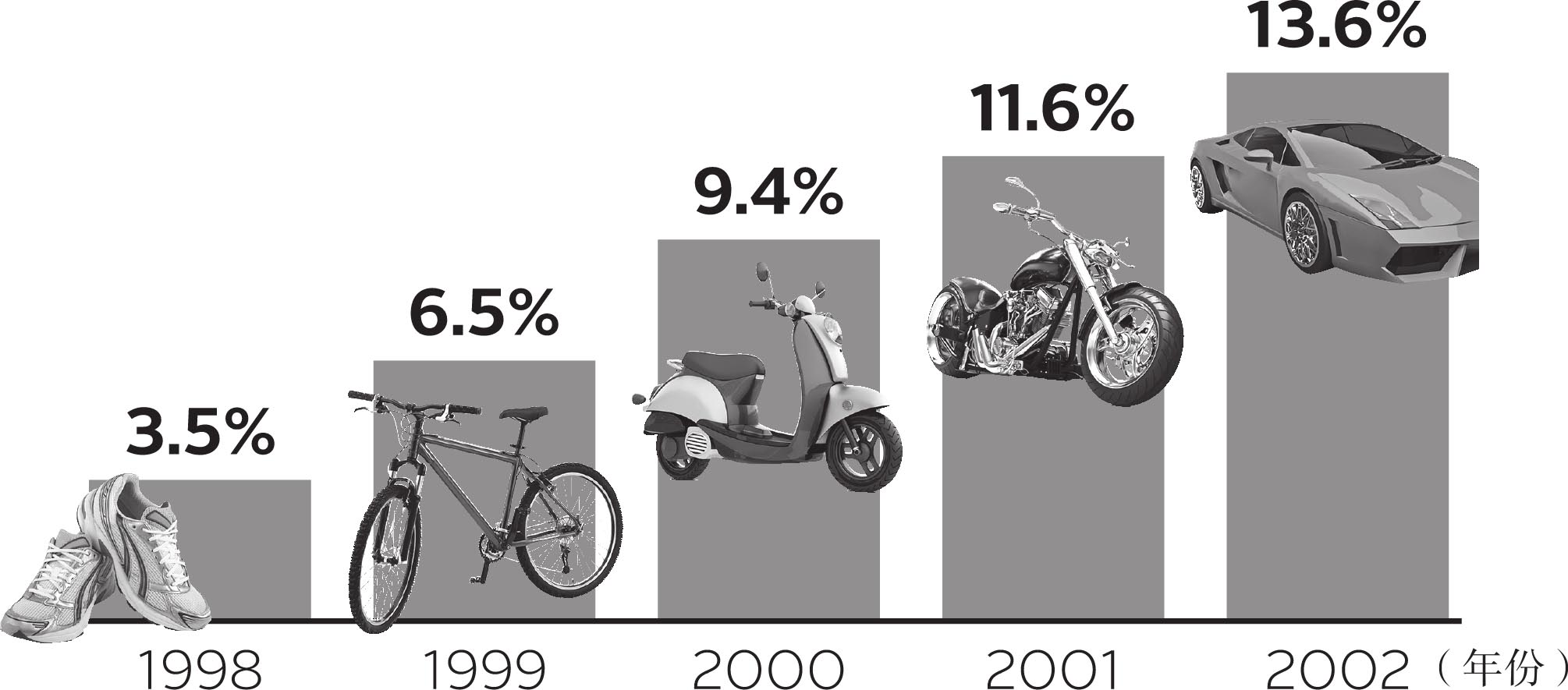 当工资收入的储蓄比例是3%的时候,图中出现的是一双球鞋的图片——因为你储蓄起来的工资收入的3.5%,未来增值的空间有限,只够买双球鞋。工资收入的储蓄比例是6.5%的时候,你未来赚的钱就够买辆自行车了。工资收入的储蓄比例约14%的时候,未来赚的钱就可以买辆豪华小汽车了。很明显,开着豪华小汽车的晚年生活,要比只能穿着球鞋自己走路强多了。3.5%和14%的储蓄比例,会让你的晚年生活像穿球鞋和开豪车一样大。