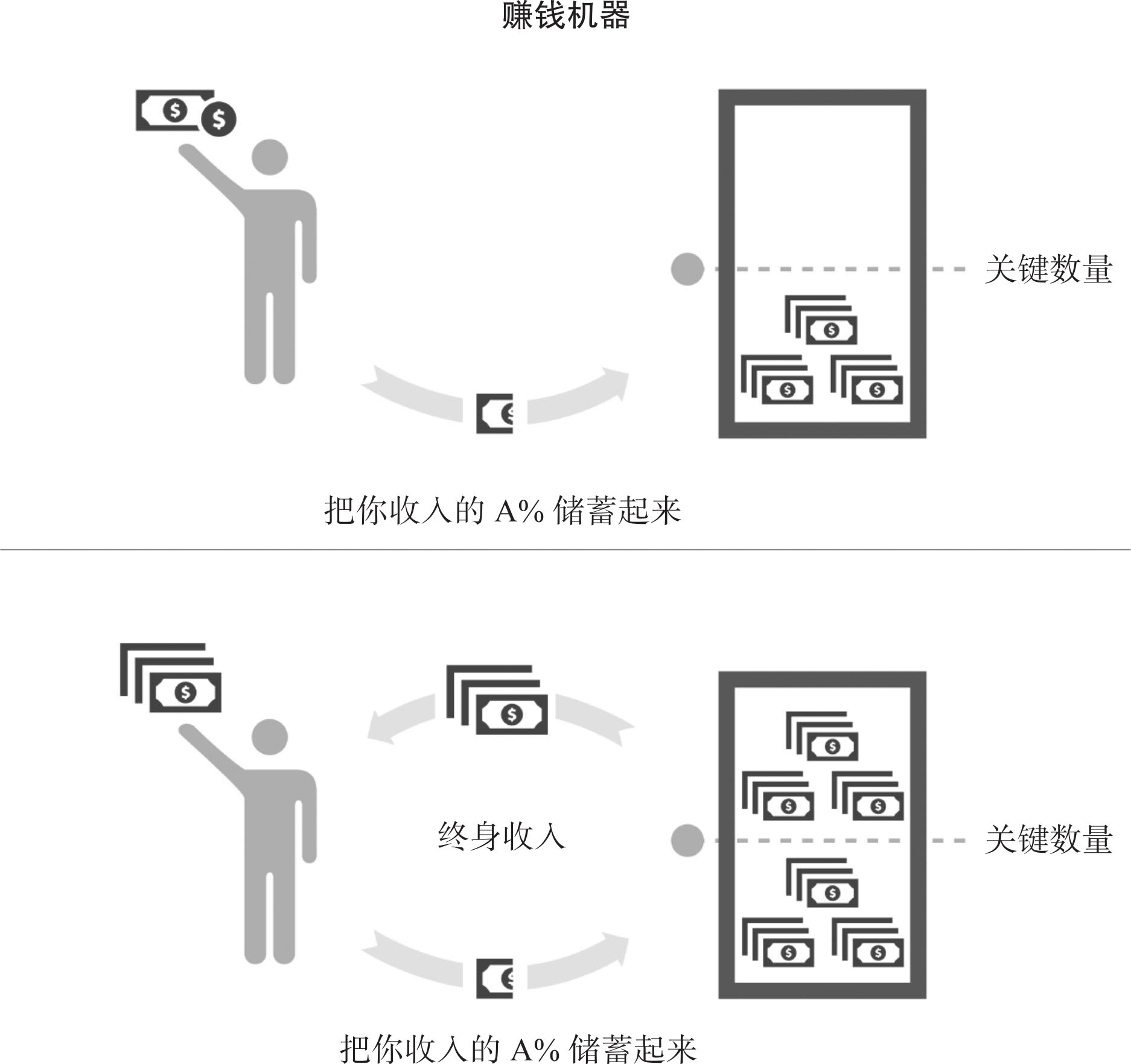 你会看到,这台赚钱机器一直不动,直到你做出一生最重要的财务决策之后,它才会开始工作。什么财务决策如此重要呢?它就是你从工资收入里拿出来多少钱作为储蓄。也就是说,在你拿到工资收入之后,在支付自己的日常生活花费前,你先要决定从总收入中拿出来多大一部分付给自己。你能(更重要的是你愿意)从工资收入里拿出来多少钱储蓄起来,不管你生活是好是坏,这些钱你都不会动。我希望你一定要好好考虑这个用于储蓄的百分比,因为你的余生都取决于这个百分比。这样做的目标是让你能够告别朝九晚五的上班族生活,走上通向财务自由的道路。你开始这条财务自由之路的方法,就是做出一个简单的决策,开始利用复利的无与伦比的巨大力量。这个决策最重要的地方是必须由你本人来做决定。只有你本人来做才行!任何人都不能替代你。