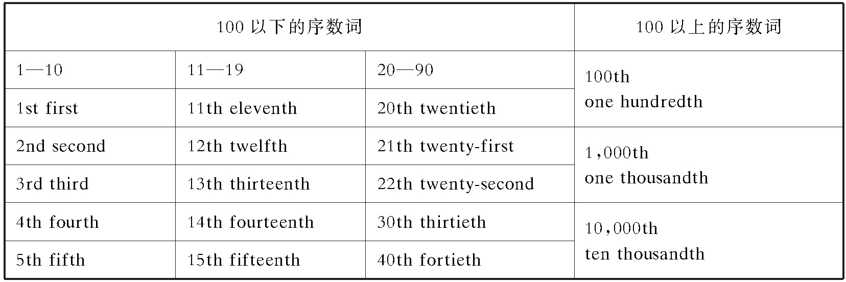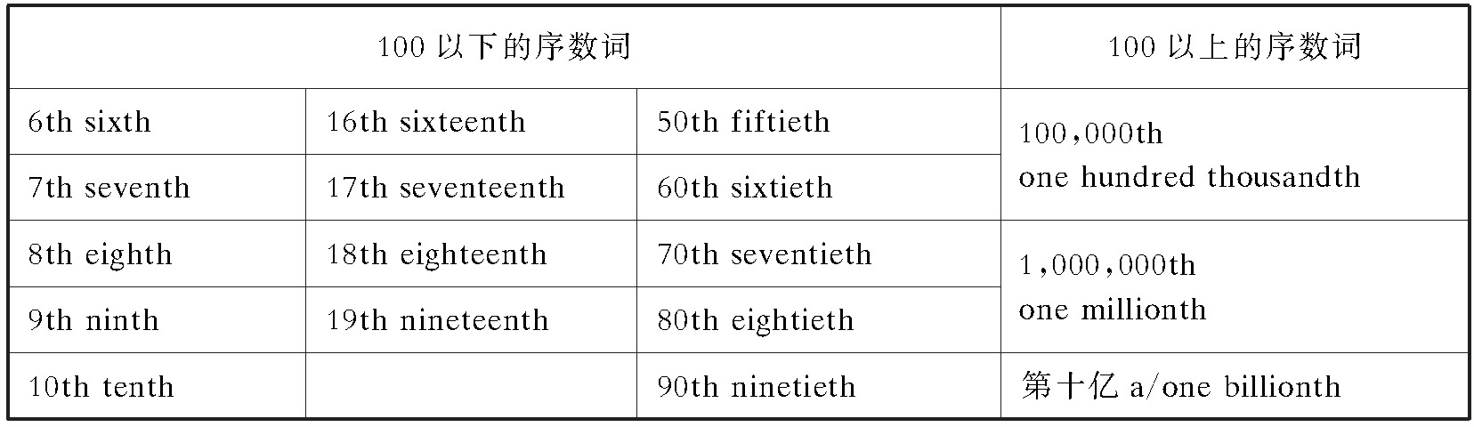 (3)两位数或两位数以上的序数词,只是最后一位用序数词,其他数字用基数词。如:第21 twenty-first;第65 sixty-fifth;第236 two hundred and thirty-sixth;第10,584 ten thousand five hundred and eighty-fourth。