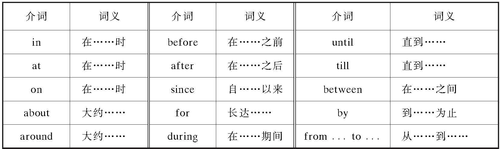 (1)表示时间的介词常用的有: