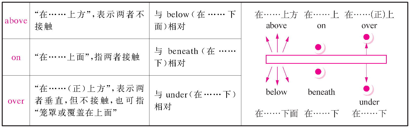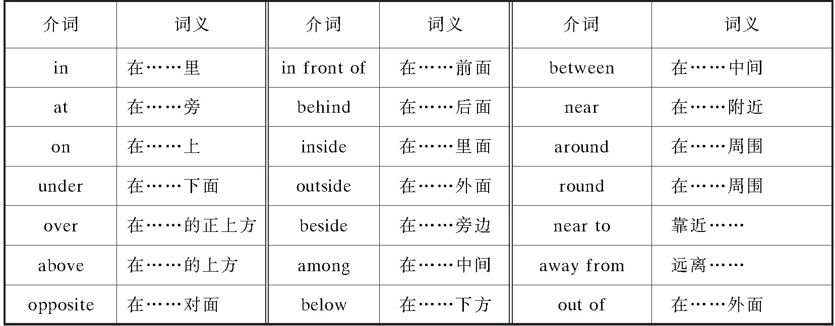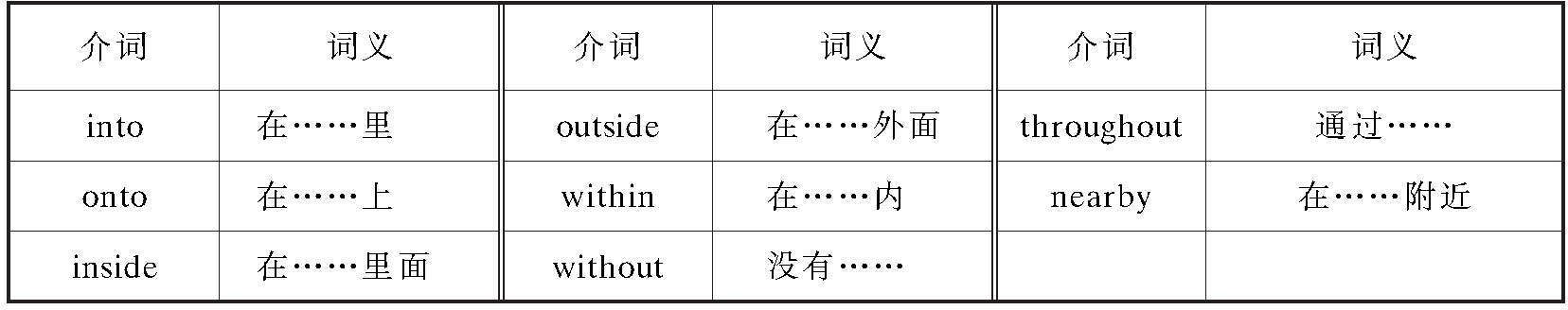 (2)表示方位空间的介词常用的有: