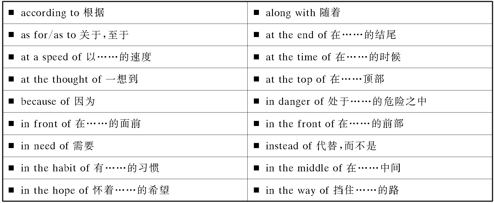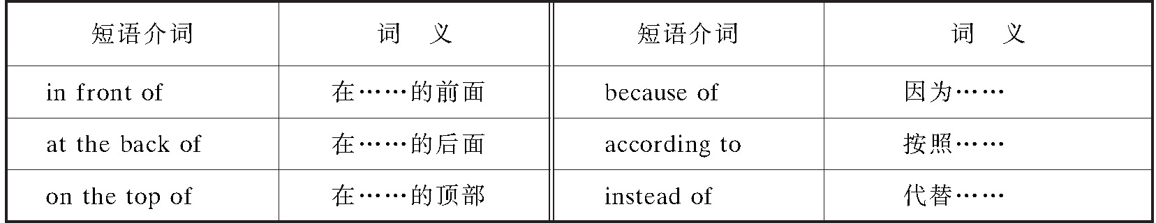 (3)短语介词是指一个或两个简单介词与一个或几个其他词类的词组合,在意义和作用上相当于一个简单介词的词。如: