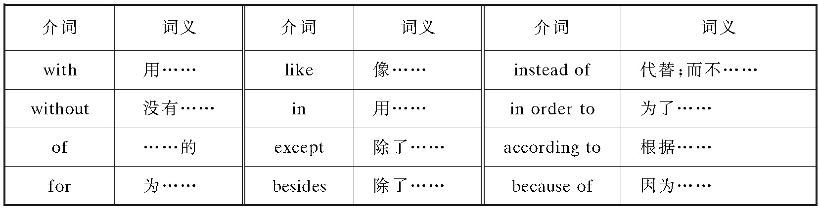 (3)表示其他意义的介词常用的有: