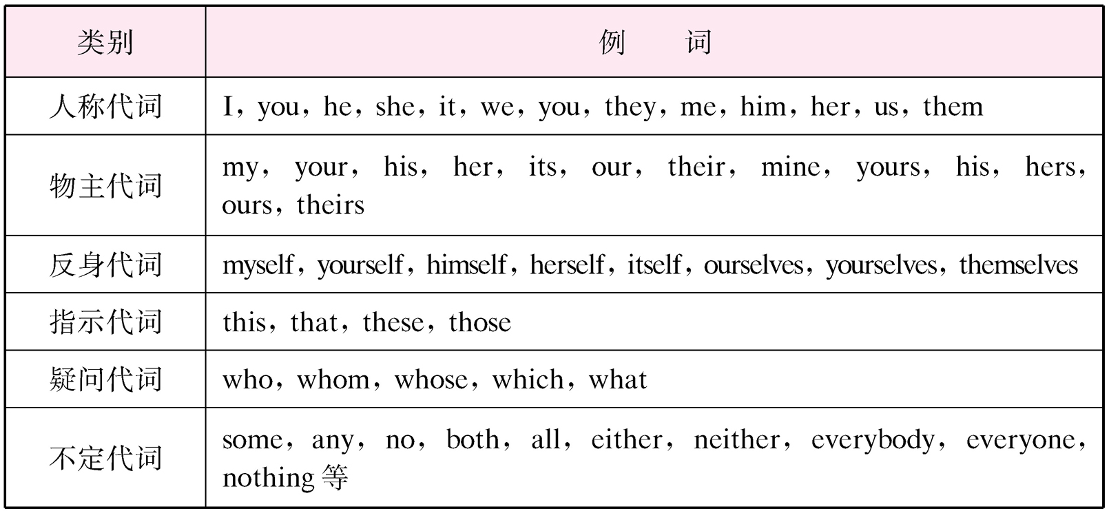 代词是就是代替名词以及起名词作用的短语、分句和句子结构的词。使用代词可以使句子变得简洁、明了。英语中的代词按其意义、特征和句子中的作用分为:人称代词、物主代词、反身代词、指示代词、疑问代词、不定代词、关系代词等。本书着重介绍前六类代词。 awJ9jpmEkhbTcDFIiQhE/0yvfH8Jn7gk7BFfh8/xo2VAqtW4XNBg/X6CSgQlRumF