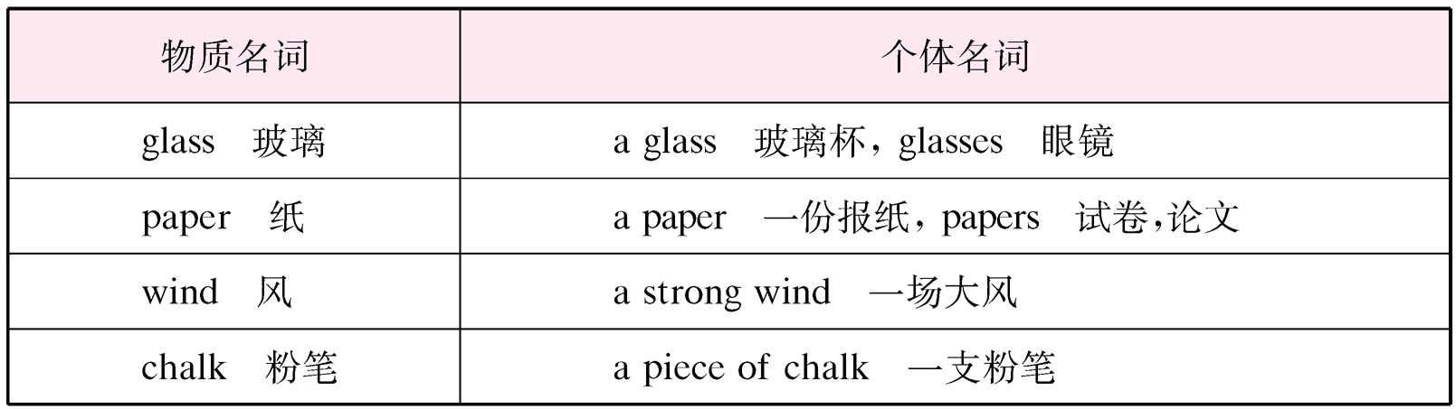 3. 物质名词:指无法分为个体的物质、材料的名词。
