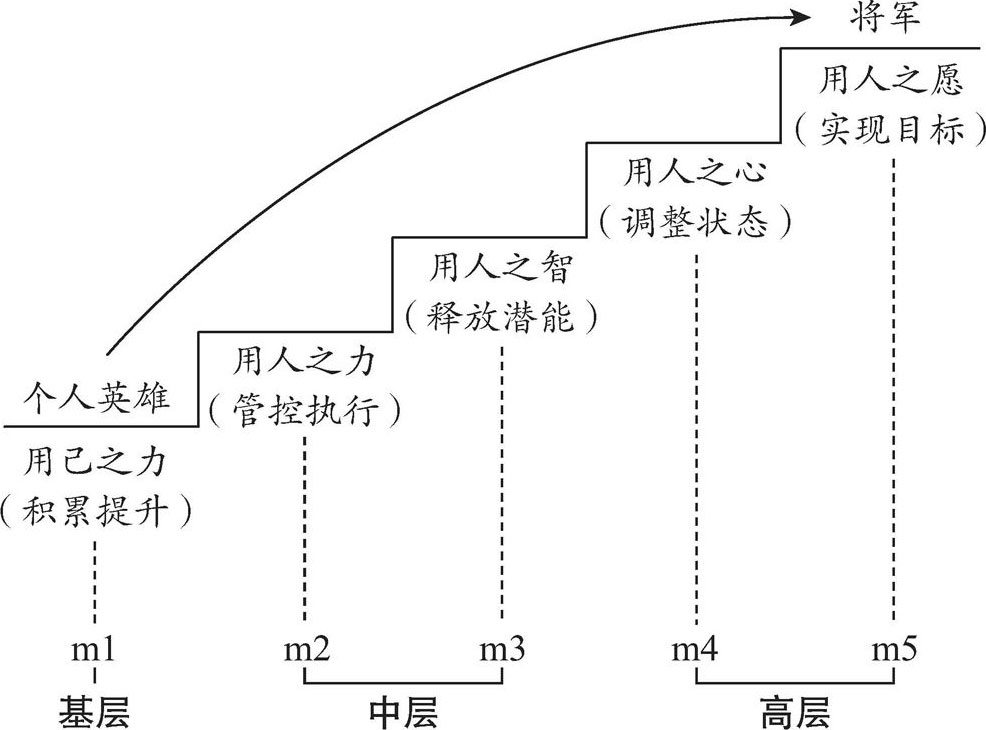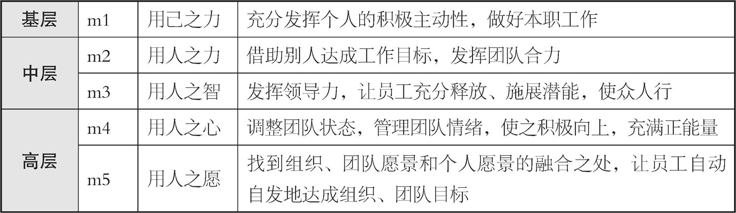 我们知道,从“用己之力”到“用人之力”“尽人之智”“尽人之心”“用人之愿”,发挥每一位下属的最大潜能,是每一名优秀管理者必经的成长上升之路,也是由“个人英雄”到“将军”的蜕变之路(如图2.4,表2.2)。
