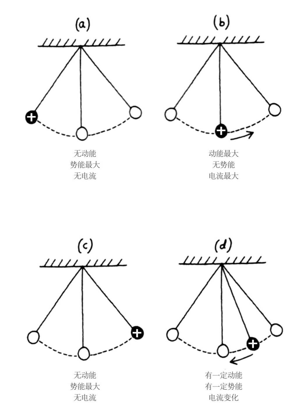 ,从而产生交流电,再把电输送到千家万户墙上的电源插座之中。电力公司输送到千家万户的电具有这样的属性:电压随着时间平滑地变化,从正电压变成负电压,再从负电压变回正电压,如此不断循环。从数学上看,这种波的形式与摆球振荡所形成的波是一样的。(因此,我们使用的电被称为交流电。)电力公司输出的交流电之所以具有这样的特征,是由发电过程决定的。发电厂运用的物理定律被称为法拉第定律,法拉第定律描述了变化的磁场如何产生电流。随着线圈的旋转,线圈内的圆形磁场也在不断发生变化,于是就产生了电流