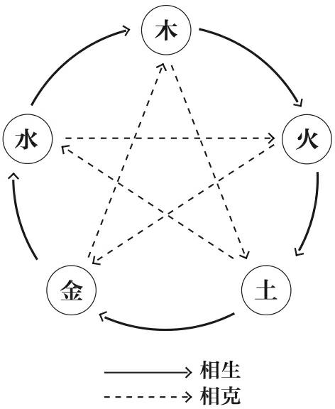 五行,即木、火、土、金、水五类物质及其运动变化。它们之间的关系,既相生也相克:每一行都可被另一行滋生,但同时也被其他行所克制。用下图表示可以非常明确: