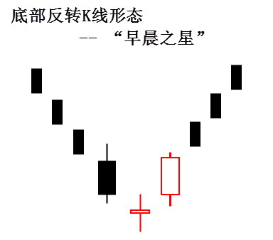 “早晨之星”是发生在波段底部,由单根K线显示可能反转的K线形态,其形如一颗即将升起的启明星,故又被称为“启明星”,预示下降趋势即将过去,上升趋势即将到来。如图3-24所示。