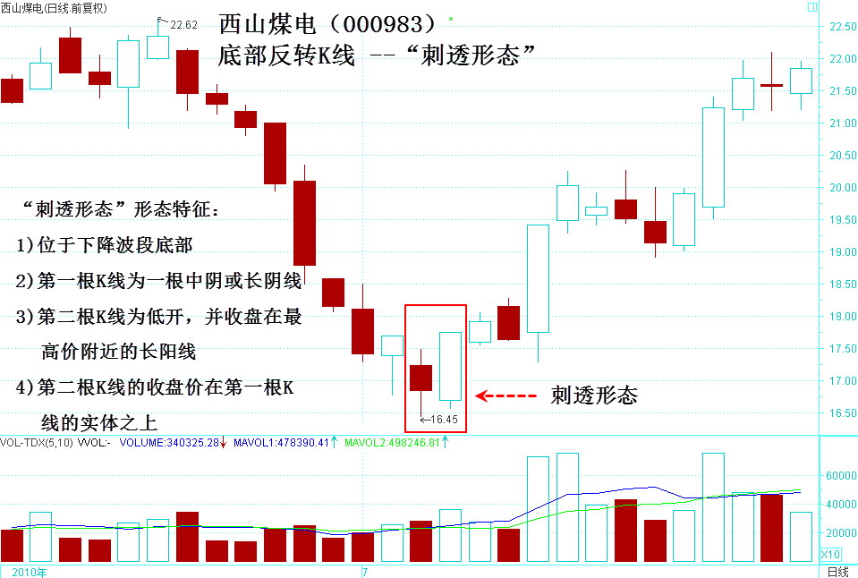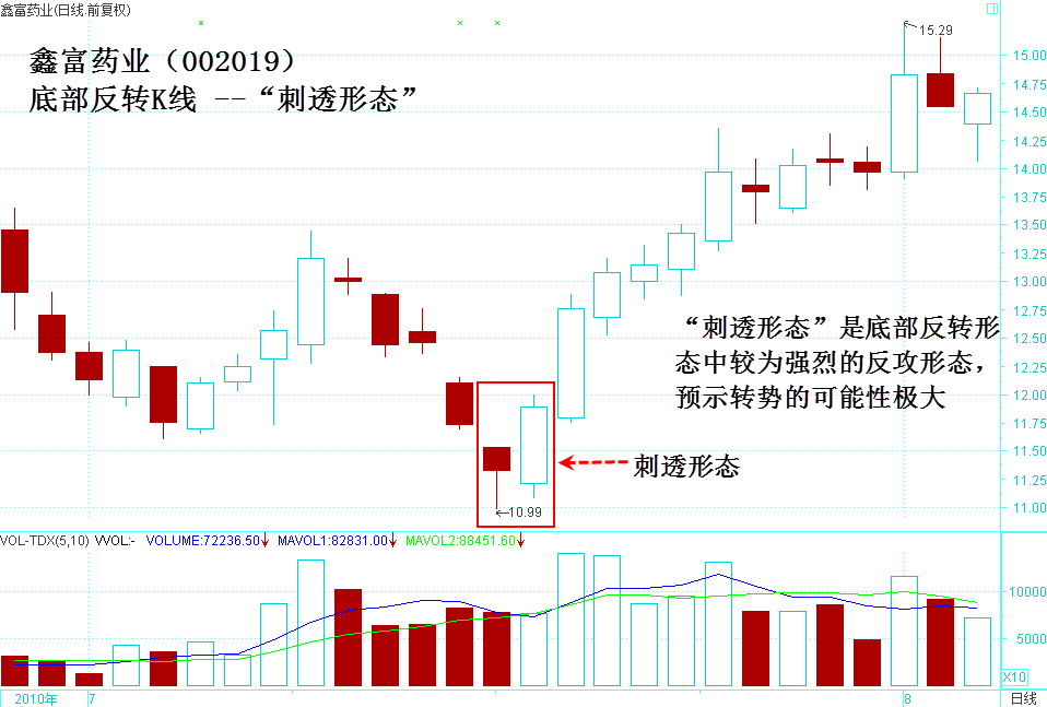 “刺透形态”是发生在下降波段底部,由两根K线组成的预示可能反转的K线形态,它是短线多头对空头强烈的反击形态,如图3-30所示。
