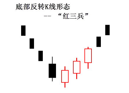 下降趋势中的红三兵与上升趋势中的三只乌鸦是相对的形态。红三兵中的三个阳线收盘价一个比一个高,实体长度也通常一个比一个大,说明市场中不断有人加入多方的阵营,此涨彼消,那么空方的力量开始减弱,市场进一步上涨的可能性在加大。通常前两根K线止住跌势,第三根K线开始向上突破压力区,会伴随成交量的明显放大。