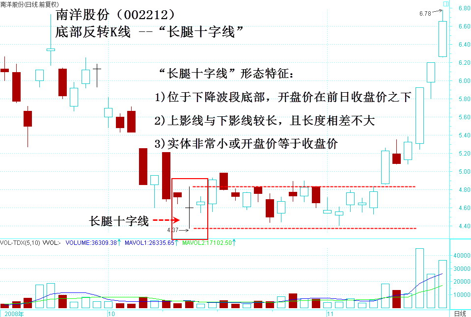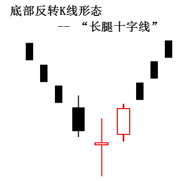 发生在长期下降趋势底部的长腿十字线是与上升趋势顶部反转形态长腿车夫相对应的形态。相对来说在波段顶部的长影线较多,因为顶部区域比底部区域的换手率更高,价格区间也更大。在下跌趋势的长腿十字线不常见,但成功率比较高。长下影线表示市场中的买盘开始复苏,由于还处于下降通道之中,主力资金往往会通过试盘来拉升价格看市场卖压的大小,当在收盘时价格再回到开盘价附近时便形成了长腿十字线。