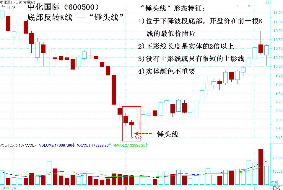锤头线可以是绿色的阴线也可以是红色的阳线,但红色的锤头更有效。