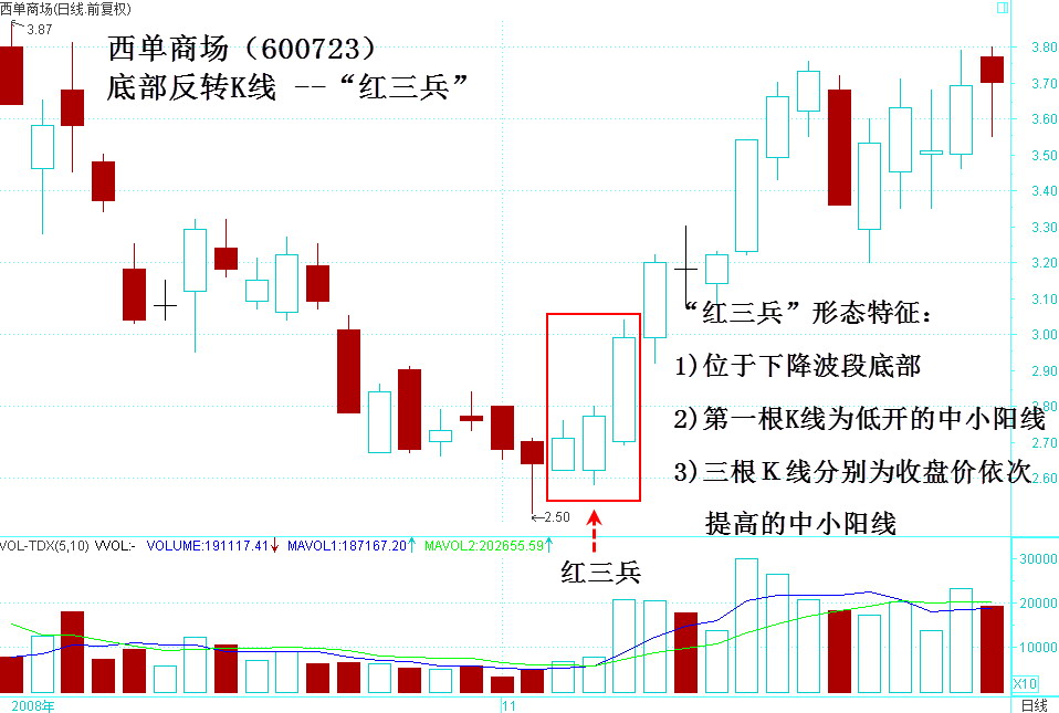 图3-34中是西单商场在2008年10月到11月的走势,该股前期处于长期的下跌趋势之中,从图中可以看到,方框标出的位置前出现了一根锤头线,初步显示转势的可能。在方框中的11月5、6、7日三天后面连续走出收盘价连续提高的阳线,符合我们讲到的红三兵形态。而且,从量能上来看,红三兵的第三根K线开始放量向上突破,也验证了形态的确立。