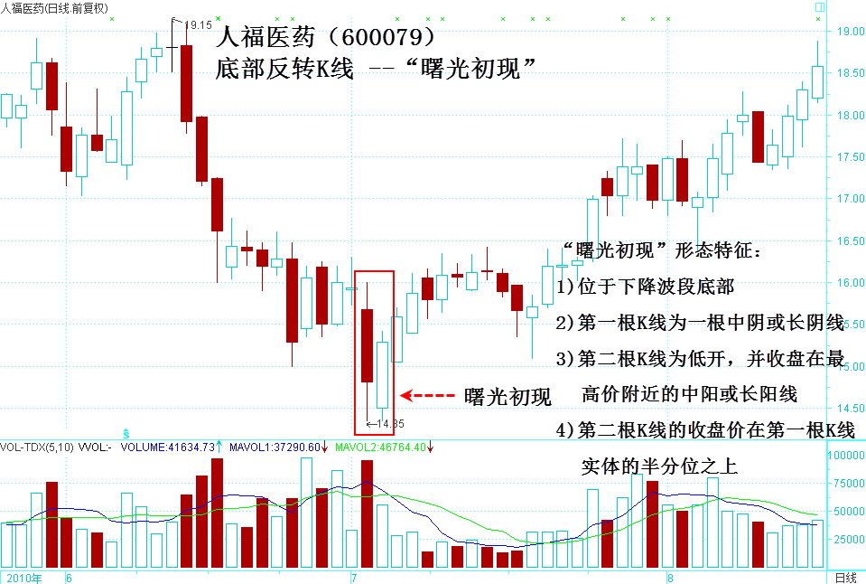“曙光初现”是发生在波段底部,由两根K线组成的预示可能反转的K线形态,它表示漫长的下跌终于见到转机的曙光,如图3-28所示。