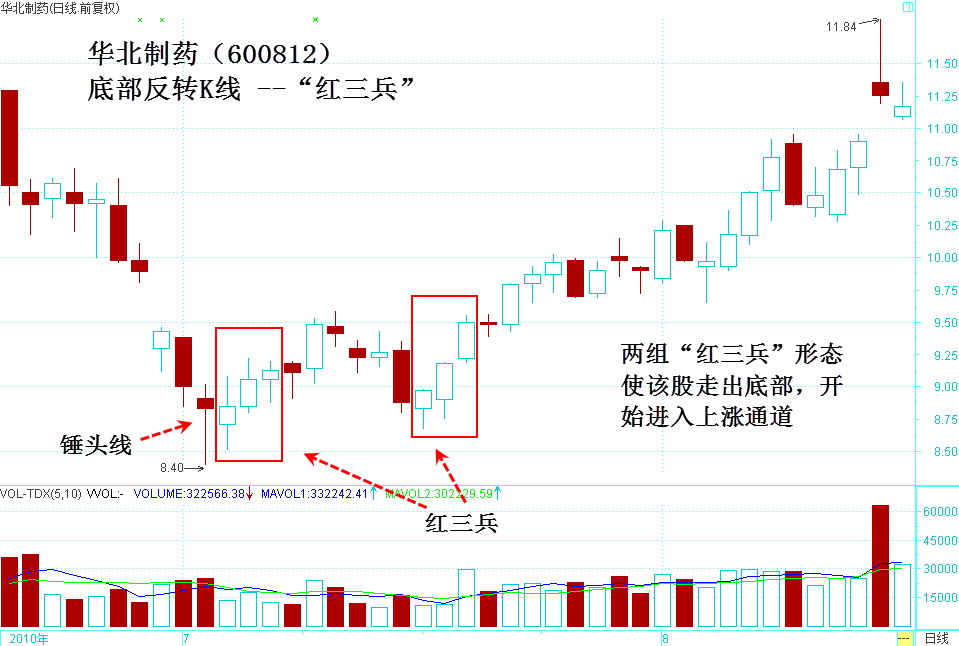 图3-35中显示的是华北制药(600812)在2010年7月到8月间的行情。图中两个方框标出的是两组红三兵形态。投资者可以自己来分析一下该股的趋势,体会红三兵的作用。