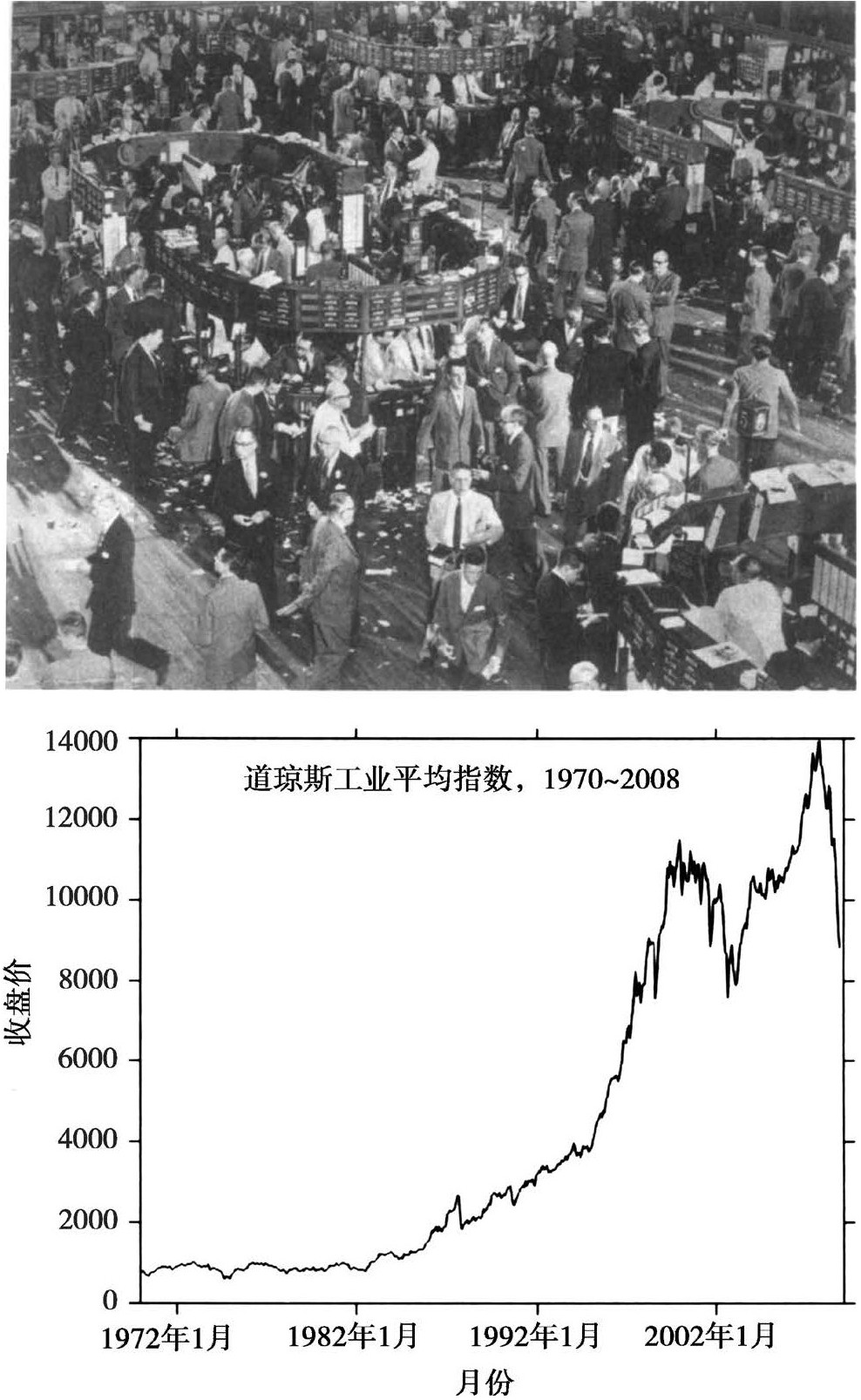 图1.4 个体的交易行为产生出金融市场无法预测的宏观行为。上图:纽约股