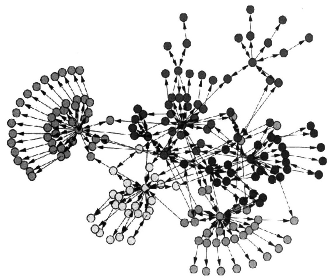 万维网诞生于20世纪90年代初,此后呈爆炸性增长。与前面描述的系统类似,万维网可以视为自组织的社会系统:每个人都看不到网络的全貌,只是简单地发布网页并将其链接到其他网页。然而,复杂系统专家发现这个网络在整体上具有一些出人意料的宏观特性,包括其结构、增长方式,信息如何通过链接传播,以及搜索引擎和万维网链接结构的协同演化,这一切都可以视为系统作为一个整体的“适应”行为。万维网从简单规则中涌现出的复杂行为是目前复杂系统研究的热点。图1.5展现了一部分网页以及其链接的结构。似乎许多部分都很相似,问题是,为什么会这样?