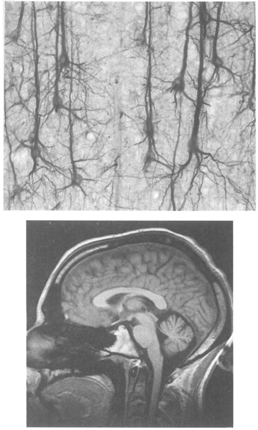 图1.2 上图:神经元着色显微图像。下图:人类大脑。一个层次上的行为是