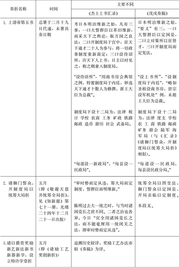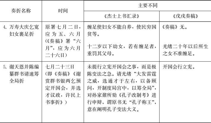 《戊戌奏稿》确存有不少可疑之处 ,如时间有差异,内容有出入,但是否全是“伪作”呢?言人人殊,难于判定。但近年自故宫博物院所藏光绪二十四年内府抄本《杰士上书汇录》发现后,问题就清楚了。今姑就《杰士上书汇录》与过去发表不同的例举如下:(见下页表)