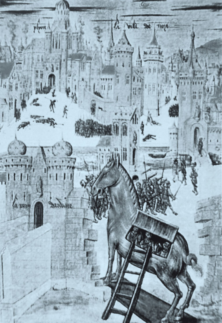 就在希腊人万般无奈之际,军中的智者奥德修斯想出了一条妙计——木马计。希腊人根据奥德修斯的建议造了一个巨大的木马。30名精兵强将藏进木马后,希腊人佯装撤退乘船离开,驶往最近的一个海岬,只把木马留在了营地。特洛伊的阿波罗神庙祭司拉奥孔竭力劝说人们不要将木马拖进城里。但这时从海里出来了两条蛇,缠住拉奥孔和他的两个儿子,咬死了他们。特洛伊人认为这是神在显灵,他们把希腊人的礼物拖进城里献给了神灵。夜里,藏匿于马腹中的希腊士兵钻出来,为大部队打开城门。于是,杀掳和抢劫开始了。国王普里阿摩斯倒在了宙斯的祭坛旁。无数特洛伊人沦为奴隶被带走,其中包括赫克托耳的母亲和他的姊妹们。其中容貌最美丽的卡桑德拉,成了阿伽门农的战利品。墨涅拉奥斯在城里找到了海伦,又一次被她的美貌迷住,把她带走了。